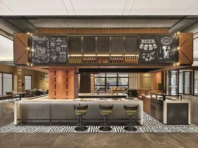 2023年,福朋喜来登推出了全新的“一站式”餐饮概念——玩啤食社(The Mesh)。作为品牌经过深思熟虑所打造的空间,不同于传统酒店功能区划,而是通过“四面吧”的设计,不同的吧台功能与对应空间形成无缝对接,将大堂吧、餐厅、社交区、移动办公、精酿体验融为一体,形成“吃、喝、玩、工作、社交”一站式场景。