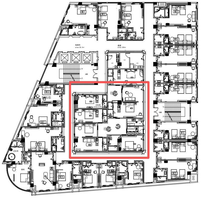 这家酒店原本有6300㎡,112间客房。蔡总他们对于空间布局,也有自己的想法,一半是普通的商务客房,专门接待周边会议中心的商务客群,另一半则做成主题客房,迎合年轻人的需求。