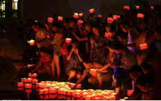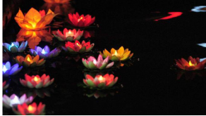 千千万万河灯飘在水面,带着美好祝福去向天边。