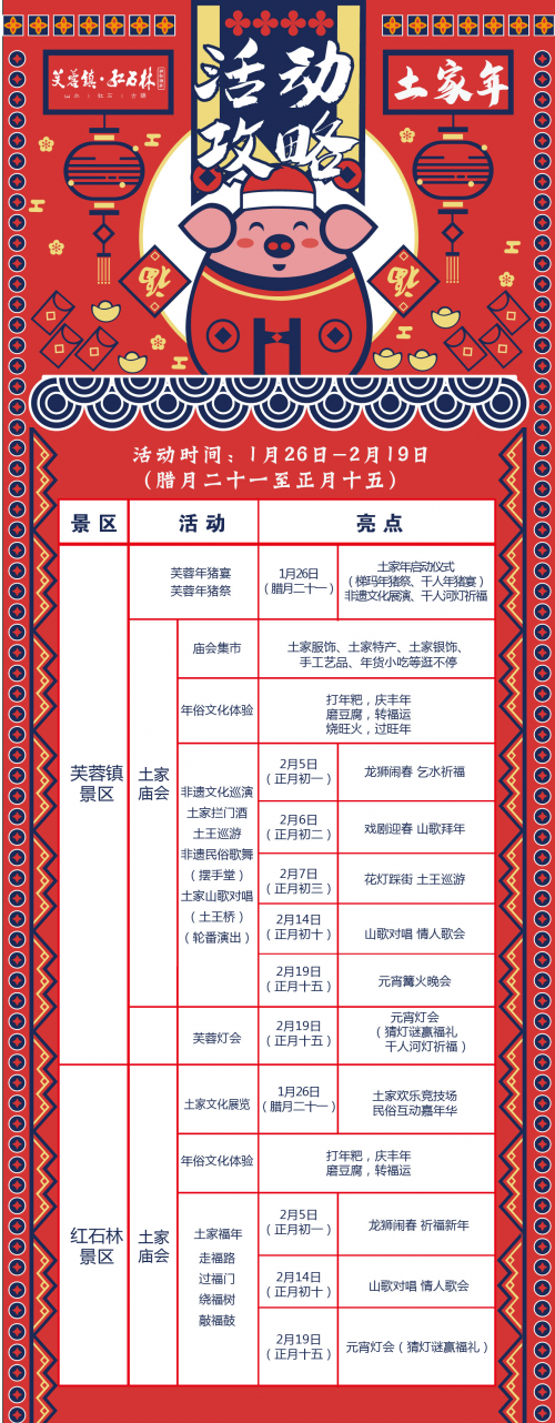 2019年1月26日-2月19日(农历腊月二十一至正月十五),芙蓉镇·红石林度假区将举办一场盛大的“土家年”活动,年猪宴、年货集市、土家庙会、芙蓉灯会、非遗文化演艺和系列土家年俗体验活动等,吃、游、娱、乐应有尽有,让游客深度体验土家赶年文化和非遗民俗时,唤起人们对传统过年的记忆。