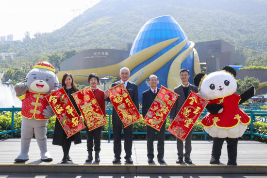 图2:(左至右)香港海洋公园万豪酒店市场传讯总监蔡静文女士;香港海洋公园营业、市务及公共事务执行总监李玲凤女士;香港海洋公园主席孔令成先生;香港海洋公园行政总裁李绳宗先生及香港海洋公园商业营运执行总监钟志超先生祝愿大家猪年大吉。