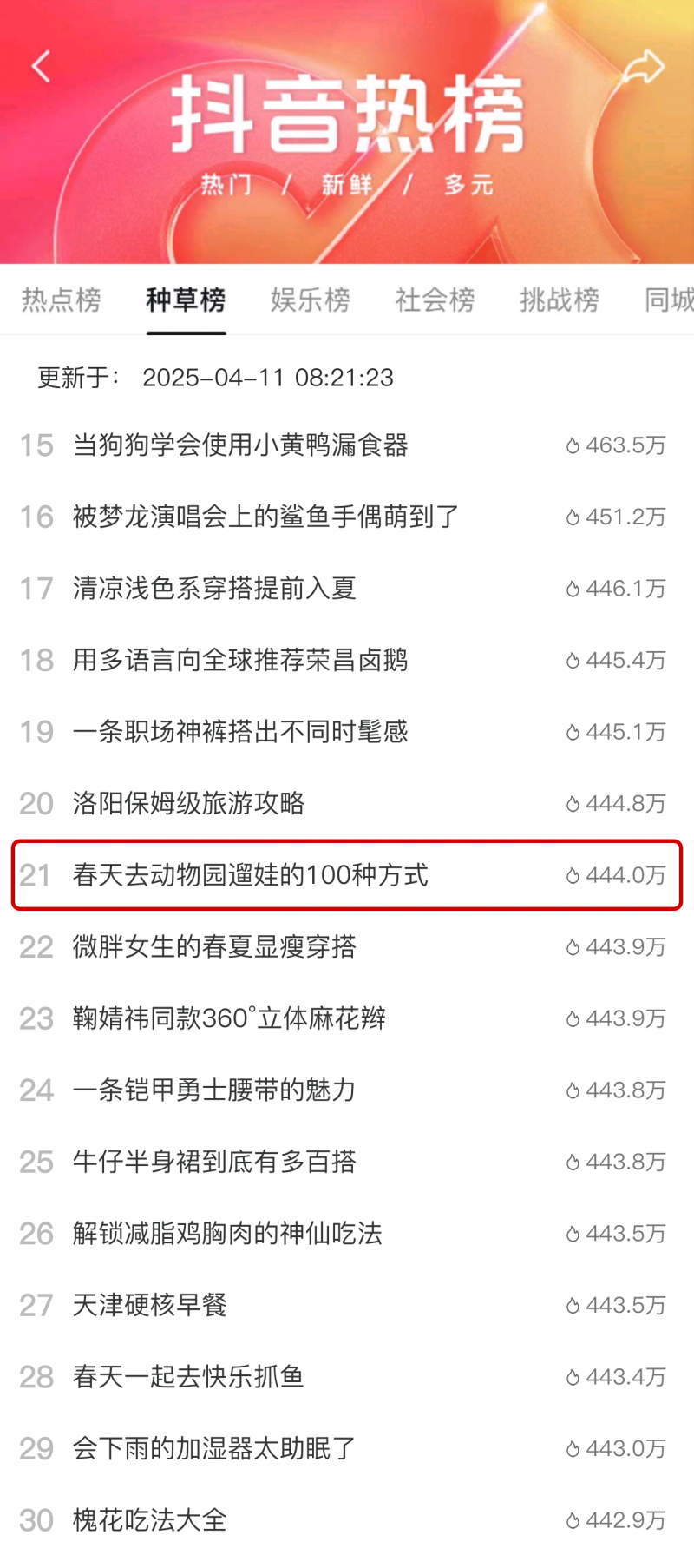 抖音站内,更是有不少家长分享着他们与孩子在动物园里的温馨瞬间,话题#春天去动物园遛娃的100 种方式 更是持续升温。@SASA的丸子妹 记录了和小羊驼之间纯粹而美好的互动,这即是自然的珍贵馈赠,也是宝爸宝妈一直在追寻的欢乐与温暖;@王十一与陈老虎 分享了婉婉在动物园里被小动物们的可爱硬控的一整天,喂长颈鹿、追小鸡,引得爸妈直呼动物比他们还会带娃;@朵朵吖 记录了虽然爸爸带娃很是兵荒马乱,但小动物的活泼可爱很快就抚平了这些……跟随着达人们的镜头,萌娃们从绘本走进真实的动物世界,时光在他们的互动中变得无比奇妙,也治愈着我们这些“屏幕前”的大朋友。