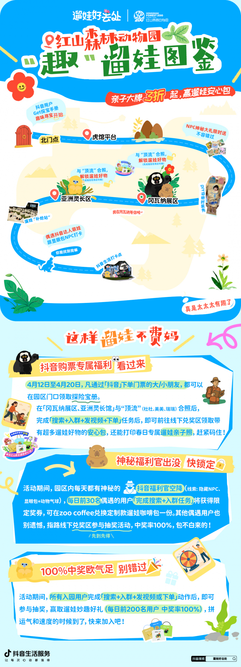 活动期间,在园内的各个角落,都有隐藏NPC——抖音福利官出没。他们会穿着醒目的服装,只要大胆上前与这些“显眼包”互动,就有机会获得惊喜礼物,让逛动物园的隐藏乐趣由大家自己去定义。此外,本次活动特别设置了入园用户“中奖率 100%” 的抽奖福利。只要你进入动物园,就可以参与赢取安心包及超多亲子好物。让你在畅快游玩的同时,还能把更多的优惠福利“打包”带回家。