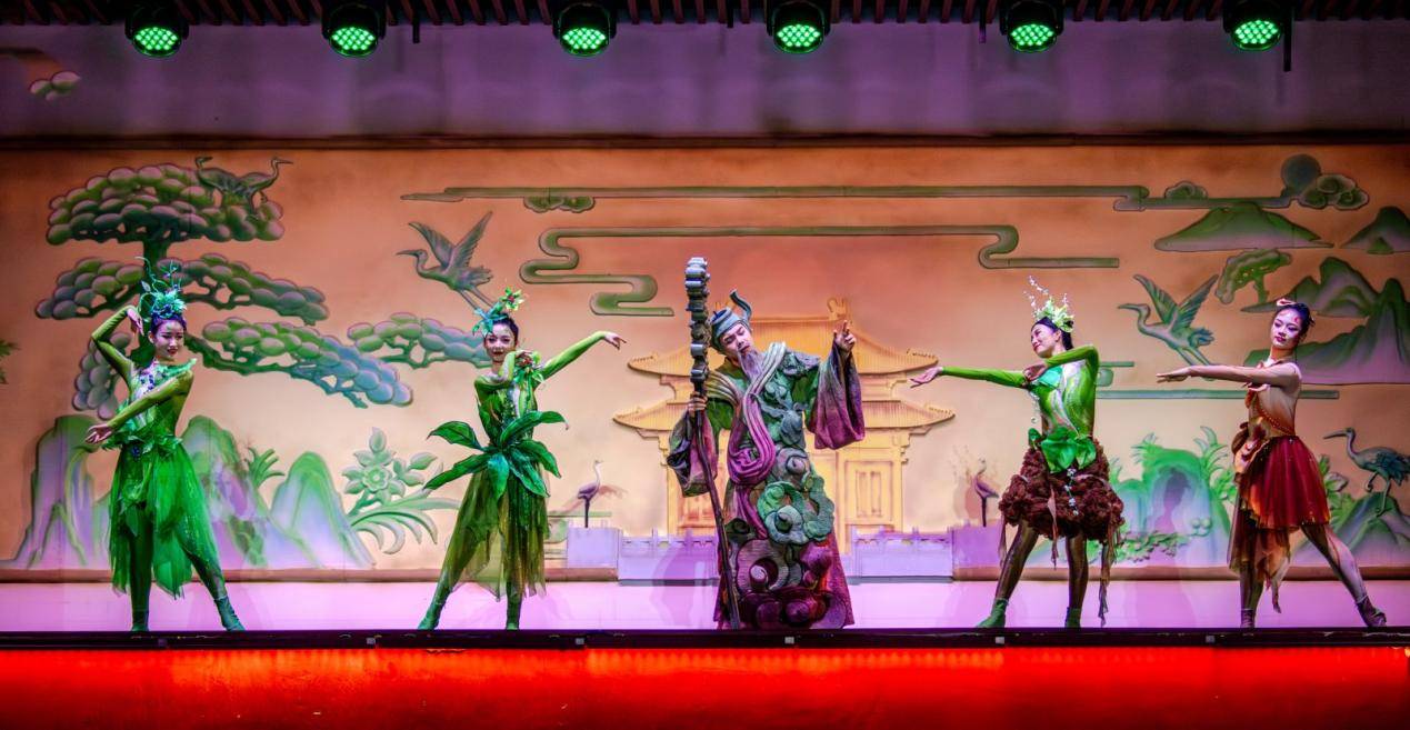 商街戏台《养生福地》 以道乐、非遗、阴阳理念与康养智慧为核心要素,为观众打造一场视听盛宴。演出中,舞者手持人偶道具,化身“天然药库”里的各类药植,以灵动舞姿展现药植的独特魅力。五禽戏表演更是精妙绝伦,一招一式皆体现着“万物与我为一”这一深邃的道家思想,让观众在欣赏节目的同时,领略到传统道家文化的深厚内涵。