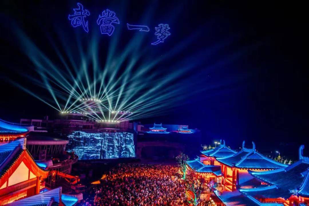 室外崖壁光影秀《太极威灵》 百米实景瀑布奔涌而下,与炫酷光影特效交相辉映,共同勾勒出一幅波澜壮阔的视觉奇景。在演出的不同时段,无人机编队将腾空而起,与绚丽烟花秀携手登场。夜空中,太极图案相互融合、龟蛇之形沉稳浮现、龙影呼啸腾飞,光影与烟花齐绽,场面蔚为壮观。